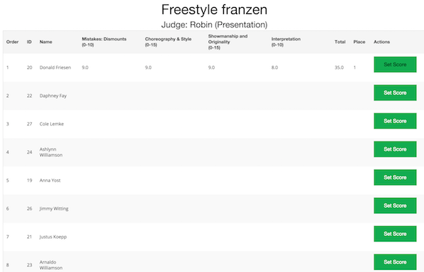 Example Judge Scoring Data Entry view: